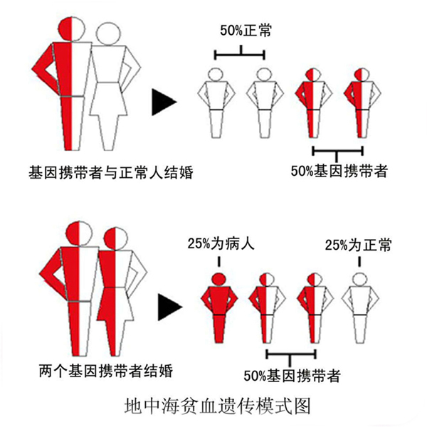 如果夫妻双方都带有轻型地中海贫血基因,他们所生出的孩子就会有50%是轻型地中海贫血基因携带者,25%的是重型地中海贫血基因携带者,生出正常基因孩子的几率仅有25%。